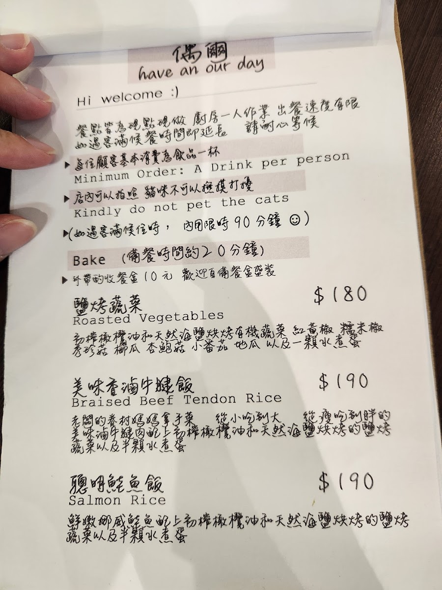 Cat Chat Cafe in Tainan offers a delightful selection of drinks and treats, perfect for a cozy cafe experience. Their menu features a variety of beverages and baked goods that cater to all tastes. The standout dessert, 司康-蜂蜜杏仁 (Scone with Honey Almond), is a must-try for anyone who enjoys a rich and aromatic scone with a touch of sweetness. For coffee lovers, the 拿鐵 焦糖瑪其朵 (Caramel Macchiato Latte) and the 美式コーヒー (Americano) provide comforting, robust flavors. If you're in the mood for something sweeter, the 生巧克力 (Dark Chocolate) is a rich indulgence that pairs perfectly with any drink. For a refreshing twist, the 蜂蜜檸檬氣泡飲 (Honey Lemon Sparkling Drink) offers a zesty, bubbly experience that’s perfect for warm days. Tea enthusiasts will enjoy the 抹茶 歐蕾 (Matcha Olay), a smooth and creamy treat, while the 伯爵 花茶 司 康 (Earl Grey Floral Tea Scone) brings a sophisticated floral twist to the classic scone. Overall, Cat Chat Cafe’s menu is a well-rounded selection that balances comfort and creativity, ensuring that every visit is a treat for both the taste buds and the soul.